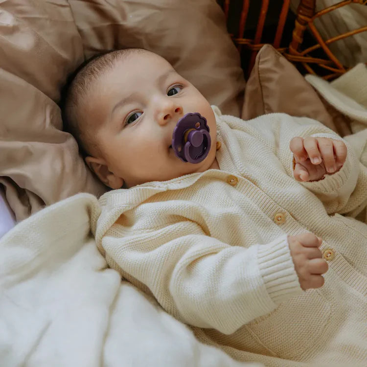 The FRIGG Daisy pacifier is designed with a round latex teat that mimics the natural shape for soothing comfort. Its daisy‑inspired shield adds a delicate floral touch while allowing airflow to reduce skin irritation. The Violet Dream color offers a soft, calming tone for everyday reassurance. Available in Size 1 (0–6 months) and Size 2 (6–18 months), this pacifier grows with your baby’s needs.