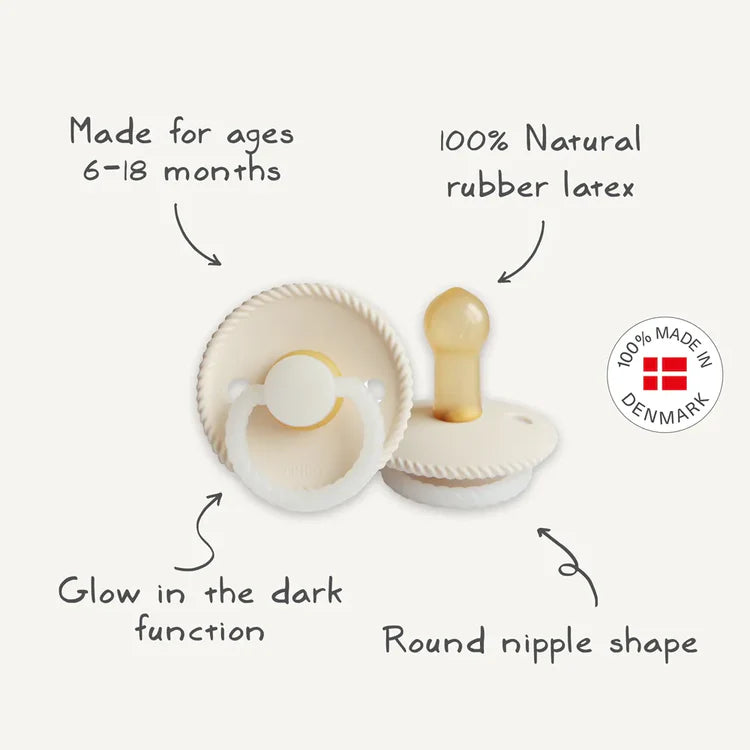 The FRIGG Rope pacifier is crafted with a round latex teat that mimics the natural shape for soothing comfort. Its rope‑inspired shield design adds a subtle, stylish detail while ensuring airflow to reduce skin irritation.