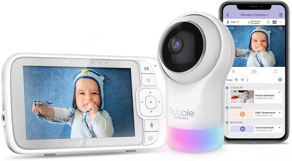 The Nursery Pal Glow Plus is a feature-rich baby monitor designed to keep parents connected and reassured. With a 5-inch HD touchscreen parent unit, Wi-Fi connectivity, and the Hubble Connected app, you can check in on your baby from anywhere. It offers infrared night vision, two-way talk, temperature monitoring, and soothing lullabies to ensure your little one’s comfort. The Glow Plus also includes a built-in night light and sleep trainer, making it a complete nursery solution that grows with your child.