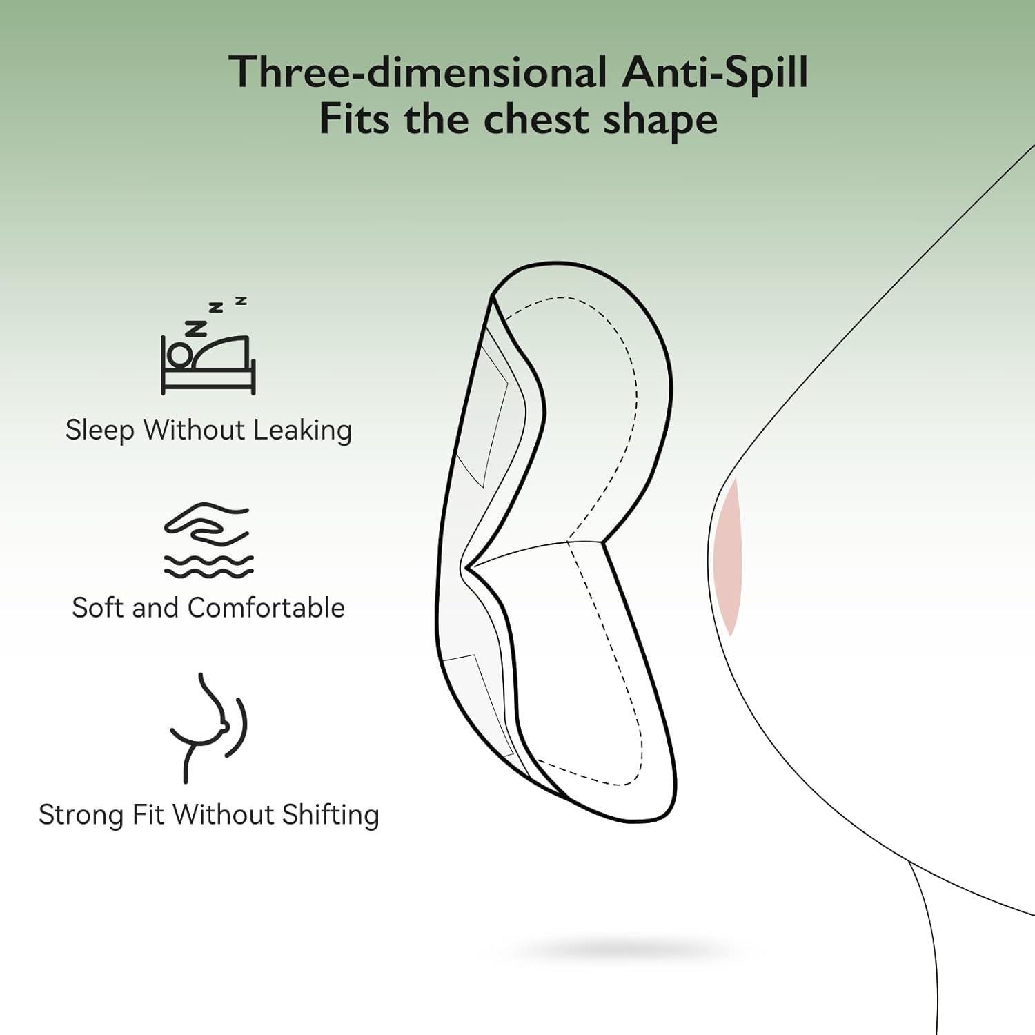 Upgraded anti-slip adhesive strip keeps pads firmly in place, preventing shifting and leaks. The ergonomic 3D shape fits the breast naturally for added comfort and protection. -