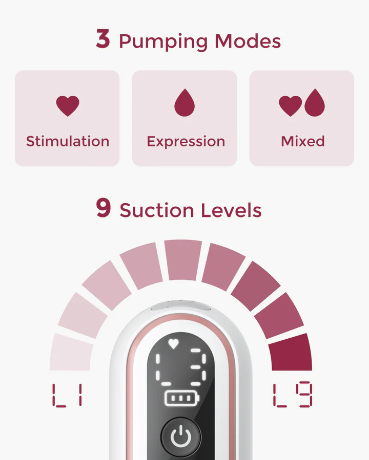 Choose from 3 modes—Stimulation, Expression, and Mixed—along with 9 adjustable suction levels, allowing you to find the most comfortable and effective setting for your breastfeeding stage. -