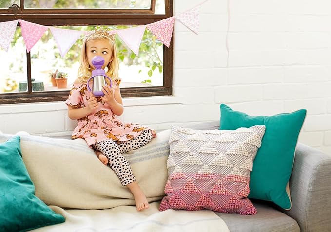 MUNCHKIN STRAW CUP: A cute spill-proof toddler water bottle and beaker with lid, plus easy grip handles and a Purple cat ear design. The flip top lid is easy for little fingers to open and close