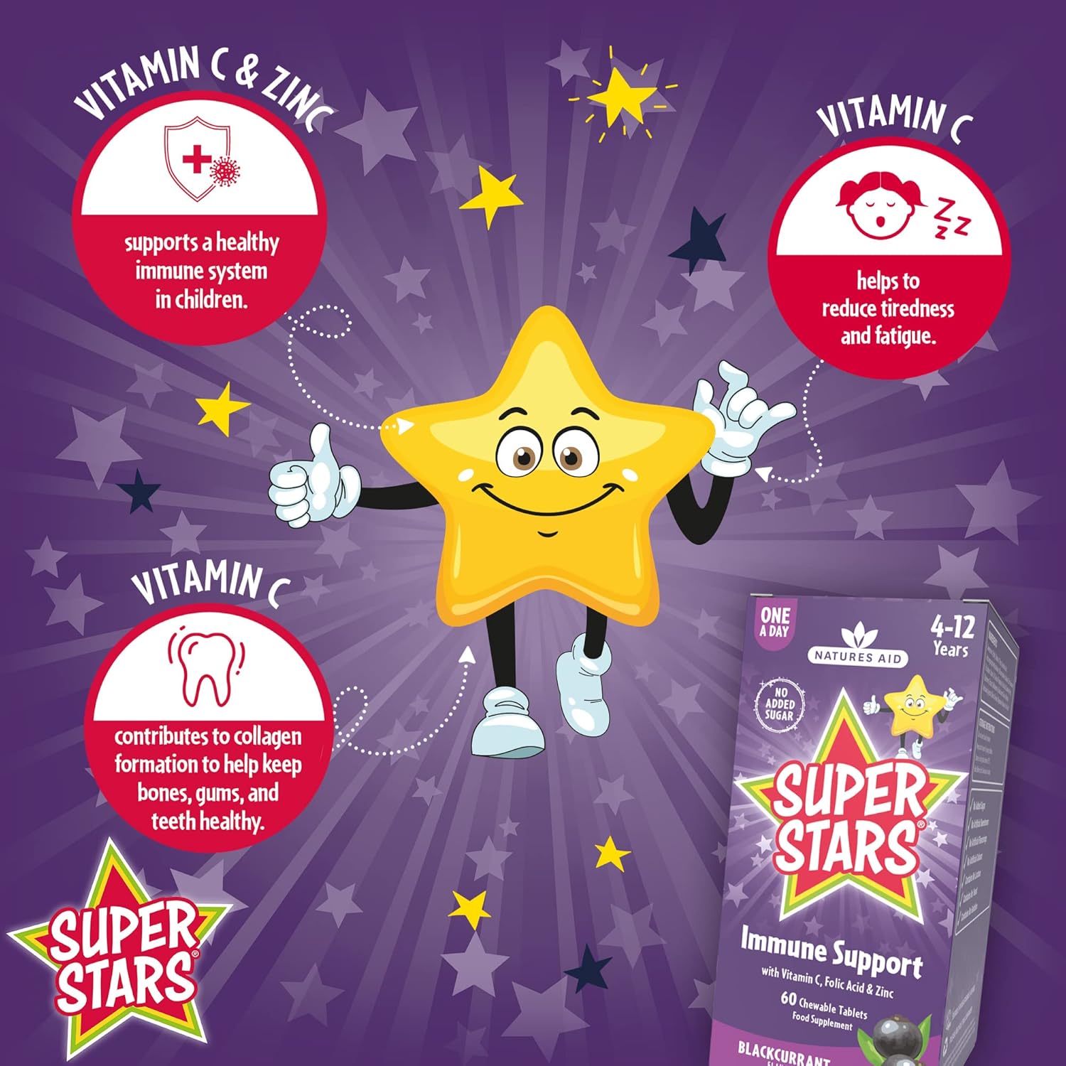 Natures Aid Super Stars Immune Support Chewables for Kids Aged 4-12 – Vitamin C, Zinc, Elderberry & Folic Acid – Supports Immunity, Growth & Energy – Natural Fruit Flavour, Vegan – 60 Tablets