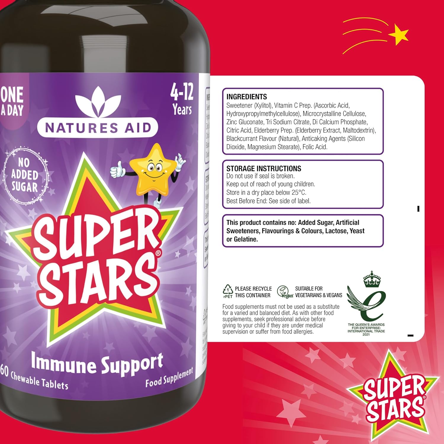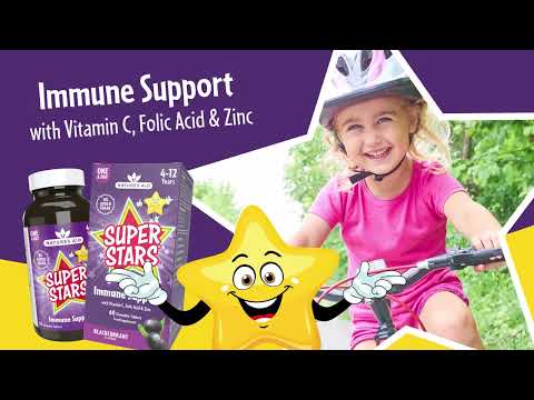 Natures Aid Super Stars Immune chewable provides 80mg vitamin C, 5mg zinc, 200µg Folic Acid and 25mg of elderberry extract equivalent to 250mg of fresh elderberries in each delicious blackcurrant flavoured chewable tablet. This immune supporting formulation can be taken daily by children aged 4-12 and contributes to the normal function of their immune system. The tablets are naturally sweetened with xylitol. Products which use xylitol instead of sugar contribute to the maintenance of tooth mineralisation making this a tooth kind formulation. One tablets can be chewed or sucked daily for children aged 4-12 and contributes to the normal function of the immune system and normal collagen formation for the normal function of blood vessels, bones, cartilage, teeth, gums and skin. The tablets are suitable for vegetarian and vegan diets and contain no added sugar, artificial flavours, colours or preservatives.